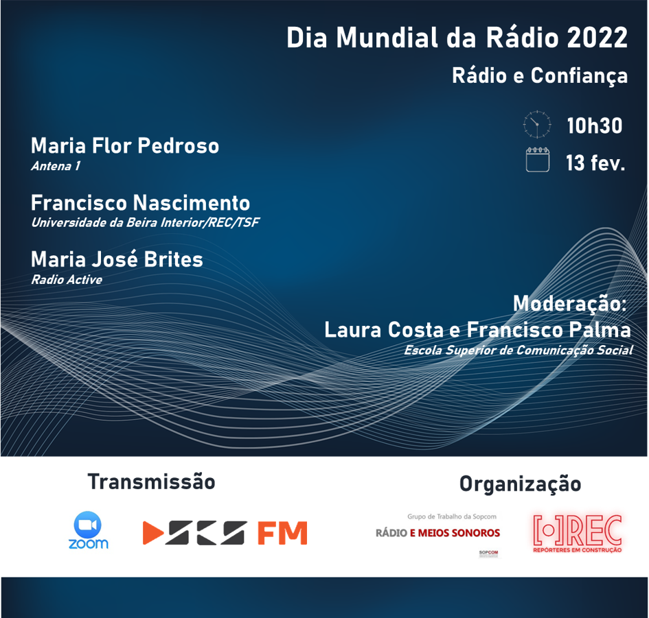 O GT de Rádio e Meios Sonoros da Sopcom, o REC e a rádio ESCS FM associam-se na organização de um debate que assinala o Dia Mundial da Rádio. Este ano, o tema do Dia Mundial da Rádio é “Rádio e Confiança”. A Unesco destaca o facto de a rádio continuar a ser um dos meios de comunicação mais confiáveis e utilizados no mundo, o que é confirmado por diversos relatórios internacionais. O tema deste ano foca-se em três pontos: Confiança no radiojornalismo; Confiança e acessibilidade; Confiança e viabilidade das estações de rádio.